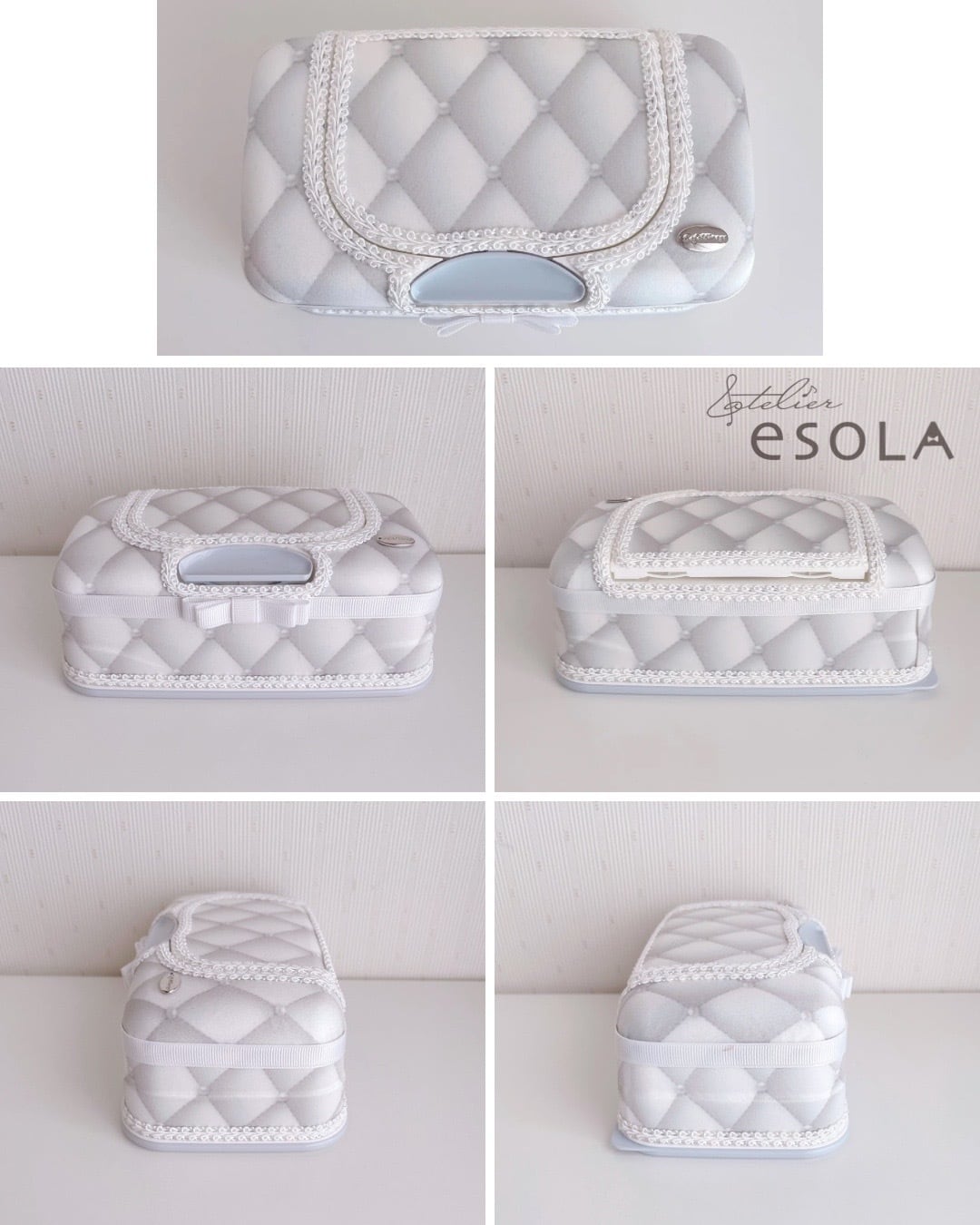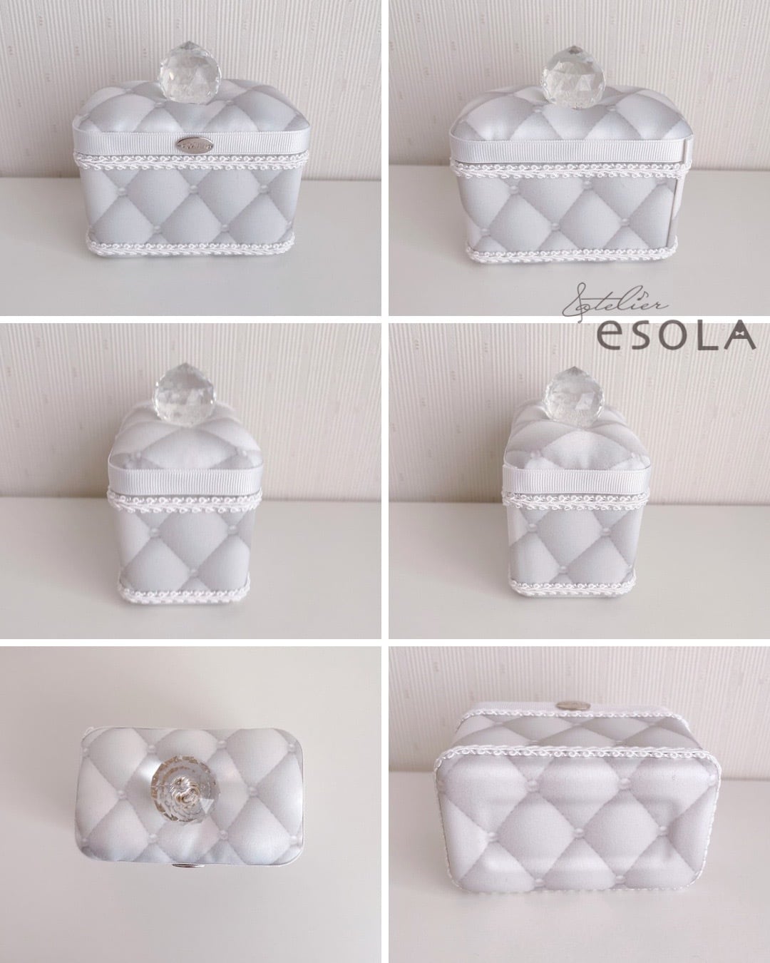 持ち手までドレスサテンを贅沢に使用。リビングの特等席に置きたくなる存在感です。